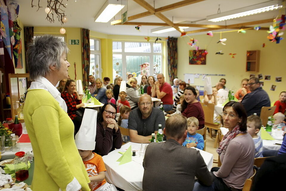 Den Eltern wird als „Nachtisch“ im Kita-„Restaurant“ noch ein Video gezeigt, das den gesamten Partizipationsprozess deutlich macht und von Swetlana Werner mit viel Liebe erstellt wurde. Für die Köche, Kita-Mitarbeiter und das Konzept gibt es großen Applaus.