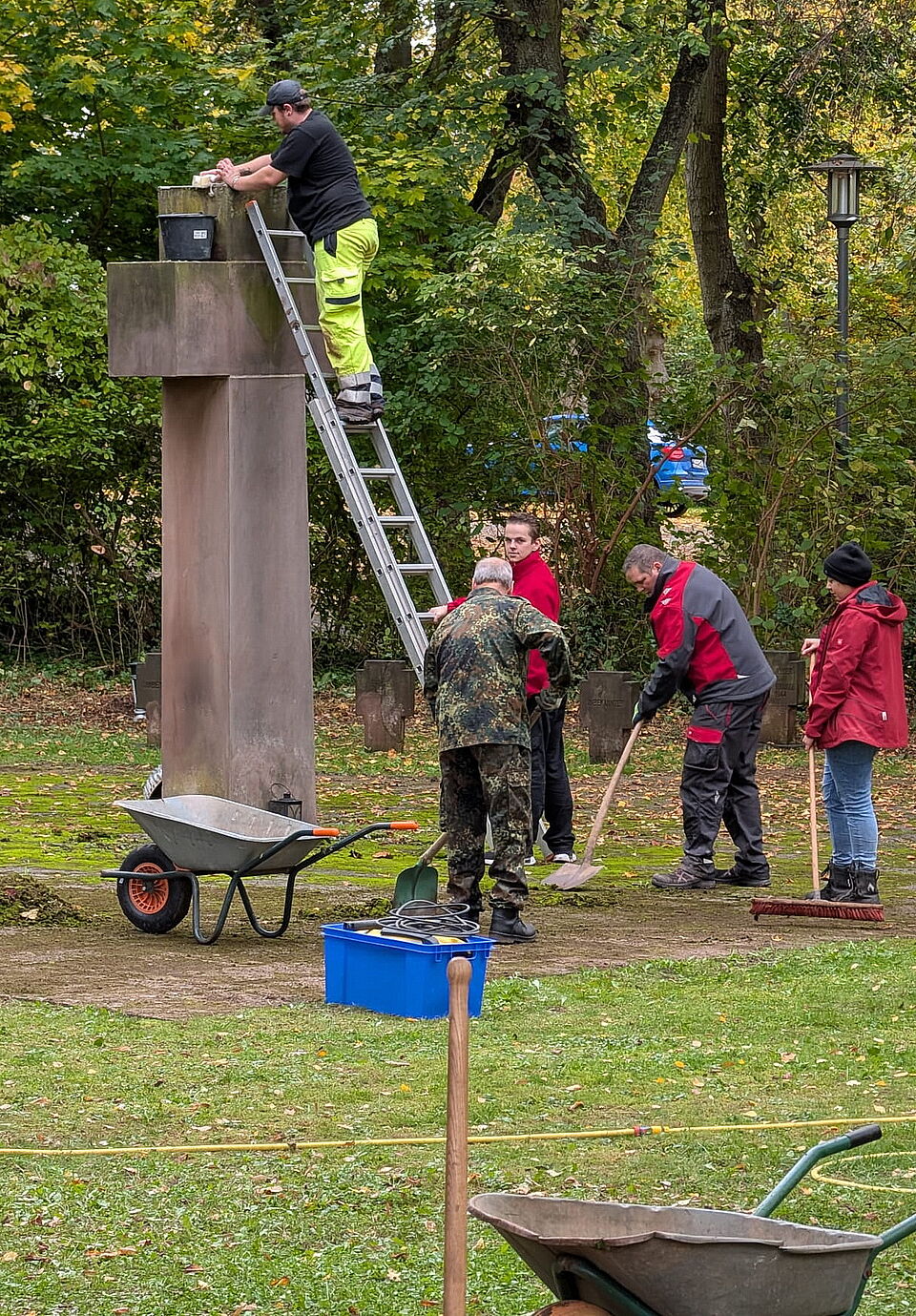 In Zusammenarbeit mit der Stadtverwaltung Mechernich, die Material zur Verfügung stellte, wurden Blumen gepflanzt, die Gräber gereinigt und die Randbefestigungen erneuert. Jetzt wurden die Arbeiten zusammen mit dem Roten Kreuz an der zentralen Kriegsgräbergedenkstätte in Mechernich fortgesetzt – und das in deutlich größerem Umfang.