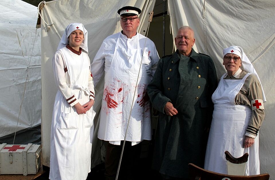 Nach der Begrüßung in der Rotkreuz-Akademie, die vom Musiker Winfried Bode aus Köln begleitet wurde, wurden die Gäste in Bussen zum neuen Museum gebracht. Dort wartete nicht nur der Küchentrupp, der 1989 in der Prager Botschaft gekocht hatte, mit Erbsensuppe. Niederländische Rotkreuz-Kollegen simulierten ein Lazarett in Zeiten des deutsch-französischen Krieges.