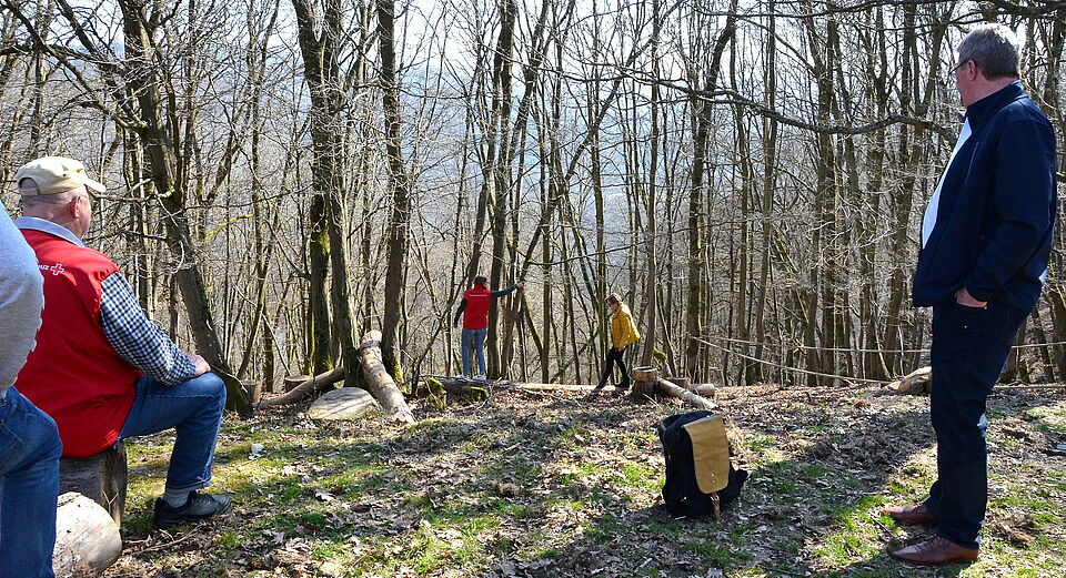 Angelica Netz ließ es sich nicht nehmen einige der Stationen, wie hier „The Bridge“, selbst auszutesten und arbeitete dabei mit Maria Steffen im Team – unter den wachsamen Augen von Rolf Zimmermann (l.) und Manfred Poth (r.) Foto: Henri Grüger/pp/Agentur ProfiPress
