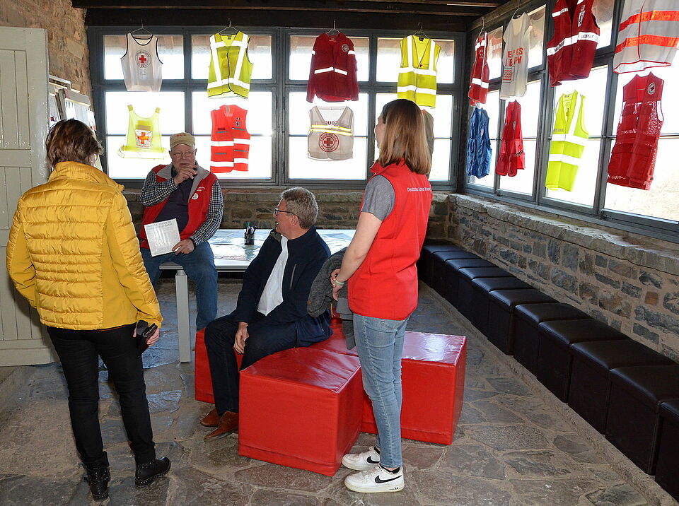 Die verschiedenen Westen in diesem Raum kommen aus verschiedenen Ländern, mitgebracht von Rotkreuz-Mitgliedern auf der ganzen Welt. Dies und mehr erklärte Rolf Zimmermann (2. v. l.) den Rotary-Gästen im Museum des Roten Kreuzes in Vogelsang. Foto: Henri Grüger/pp/Agentur ProfiPress