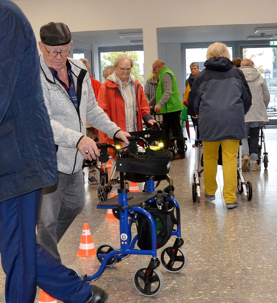 Ganze drei Stunden dürfen die Besucher des Kurses verschiedene Übungen zur sicheren Handhabung der flotten Gehilfen teilnehmen. Dabei wird jeder Kurs mit einem Rollator-Check begonnen - einer Art TÜV.