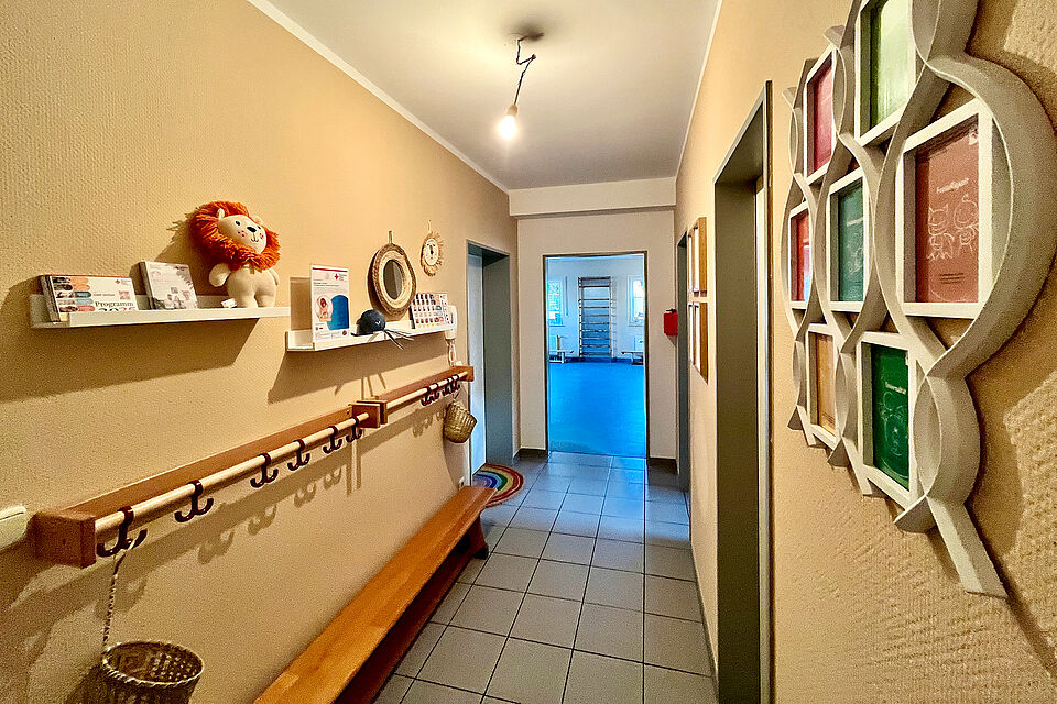 Die sind jetzt in viel Eigenleistung aufgehübscht worden. So konnte bei 3000 Euro Materialkosten ein tolles Ergebnis erzielt werden. Der Seminarraum als Herzstück wurde ebenso gestrichen wie der Flur. Die Wände sind mit familiengerechten Deko-Elementen versehen. Ansprechende schwarz-weiß Fotos in einer Petersburger Hängung verzieren die Stirnwand des Seminarraums. Dort wurden auch neue Haken in die Decke geschraubt, um Bewegungslandschaften für Eltern und Kinder flexibler im Raum gestalten zu können.