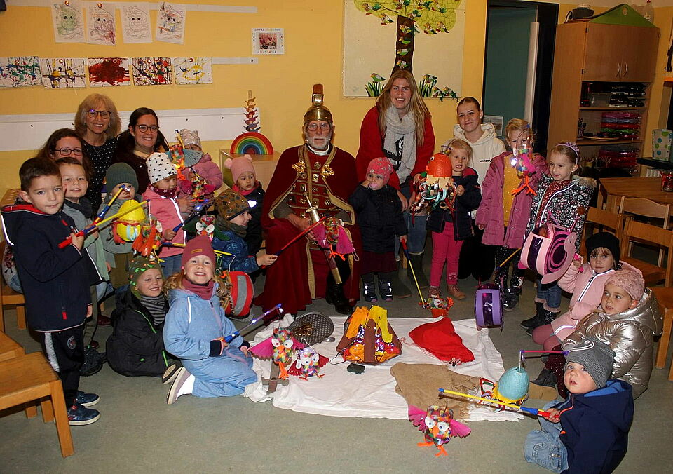 Nachdem sich die Kinder am großen Tag in ihren Gruppen gesammelt haben, stattete „Sankt Martin“ ihnen persönlich einen Besuch ab. Anschließend fand sogar ein Laternenumzug mit „Sankt Martin“ hoch zu Ross, einem Tambourcorps und den Eltern hintendran statt. Am Ende des Zugweges gabs ein Martinsfeuer und die Kinder konnten zusehen, wie der Heilige seinen Mantel mit dem armen Bettler teilte. Ganz zur Freude der Kinder verteilten die Beiden im Anschluss leckere Hefestuten. Alternativ konnte man im Beisammensein ein warmes Getränk oder ein herzhaftes Würstchen genießen.