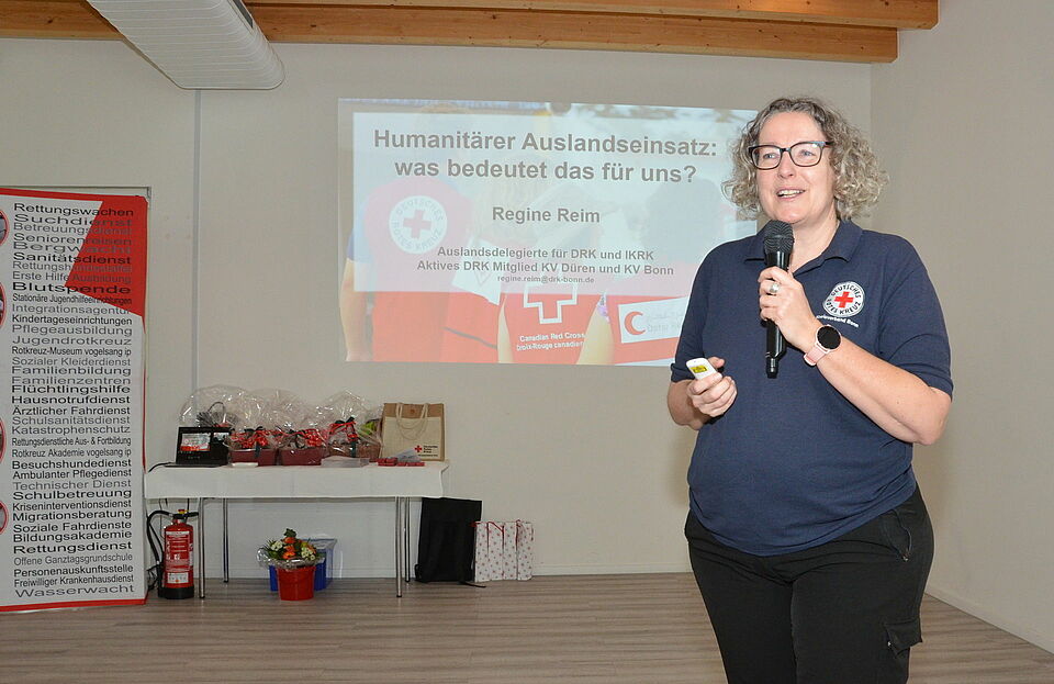 In ihrem Vortrag zeigte sie Impressionen, erzählte vom Leid der Menschen und ermahnte die nicht zu vergessen, die weiterhin Hilfe benötigten. Sie stellte fest: „Leid kennt keine Religion. Wer soll also helfen, wenn nicht wir als Rotkreuz-Familie in 191 Ländern weltweit? Deshalb danke ich Euch herzlich für Euren Einsatz!“ Das Publikum antwortete ihr mit großem Applaus.