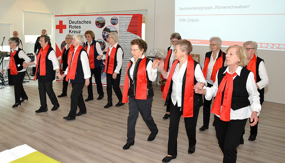 In frühlingshaftem Seeambiente leitete den Empfang wie gewohnt ein Film ein, der die vielen Arbeitsbereiche der rund 430.000 aktiven Mitglieder des DRK auf dem Land, im Wasser und der Luft zeigte. Im Anschluss schwang dann die rotkreuz-eigene Seniorentanzgruppe „Römerschwalben“ das Tanzbein, bevor der Ortsverbands-Vorsitzende Lothar Henrich nach schallendem Applaus Worte an die Anwesenden richtete.