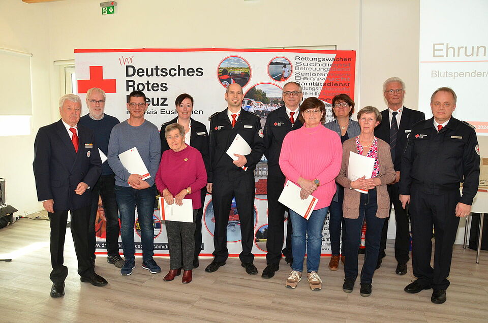 Mit Geschenkkörben, Urkunden und goldenen Ehrennadeln des DRK-Blutspendedienstes West wurden erst die Blutspender honoriert, die insgesamt 1350 Blutspenden in einer Gesamtmenge von 675 Litern gespendet hatten. Für 25 Spenden: Victoria Bell, Mike Dieffenbach, Yannik Fischer, Bernhard Rücker, Anna Steinmann, Sascha Ayaz, Ingeborg Faßbender-Mohr, Marijke Kilber, Markus Kiwall und Peter Josef Grote. Für 50 Spenden ehrte man Karin Zingsheim, Frank Schröder, Ursula Sperlich, Bernd Albert Weber, Marion Haas-Augé, Anette Wagner und Elisabeth Pilnei. Olaf Haase und Maria Liebertz hatten 75 Spenden erreicht.