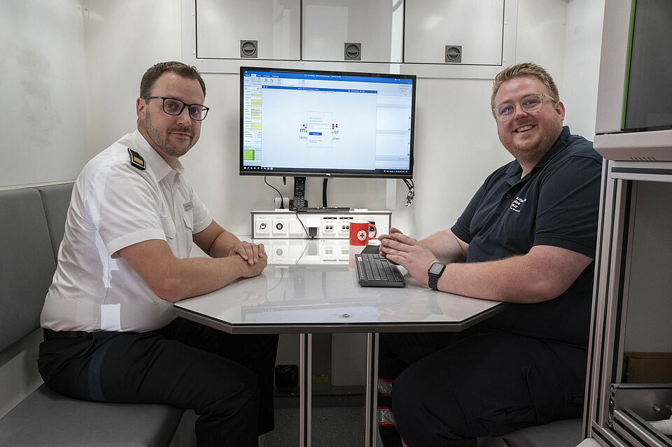 Neben den Wasserrettern präsentierten Alexander Heine und Timo Prinz den modernen Einsatzleitwagen des DRK. „Während eines Einsatzes können wir aus dem Auto heraus unsere Kräfte koordinieren“, erläuterte Timo Prinz von der Kreisbereitschaftsleitung. Auch der Austausch mit Einsatzkräften anderer Partner erfolge darüber.