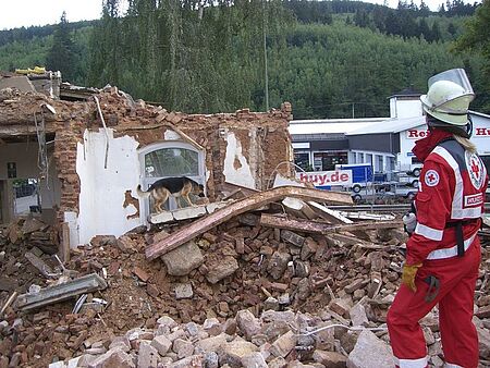 Güdderath - Auf der Suche nach verschütteten Personen können Rettungshunde ein effektives Einsatzmittel sein. Neben den Flächensuchhunden, die ausgebildet werden, um vermisste Personen in z. B. unwegsamem Wald- und Wiesengelände aufzuspüren, kann die Rotkreuz-Rettungshundestaffel im Kreisverband Euskirchen über einsatzfähige Rettungshundeteams für den Bereich der Trümmersuche verfügen.