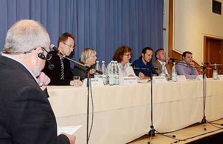 Rotkreuz-Geschäftsführer und AGW-Vorsitzender Rolf Klöcker hatte eingeladen: Podiumsdiskussion der Arbeitsgemeinschaft der Wohlfahrtsverbände im Kreis Euskirchen mit den Bundestagskandidaten Detlef Seif, Gabriele Molitor, Helga Kühn-Mengel, Jörg Kutzer, Florian Völlger und Thomas Winzberg - Impulsreferat von Bernd Altgen, Vorstandsvorsitzender der VR-Bank Nordeifel eG, der im Kreis Euskirchen ein Netzwerk für Unternehmen, Wohlfahrtsverbände und Behörden zu knüpfen sucht - Moderator Manfred Lang nahm Politiker nach Meinung der Presse an die „kurze Leine“
