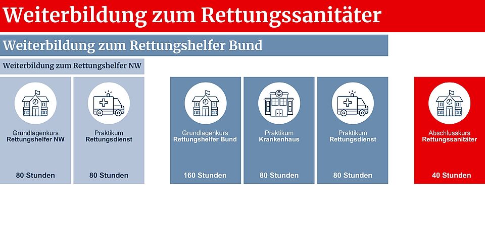 Unsere Ausbildung ist modular strukturiert und beginnt mit dem Rettungshelfer NW. Darauf folgen der Rettungshelfer Bund und schließlich der Rettungssanitäter. Jeder Abschnitt schließt mit einer anerkannten Qualifikation ab und kann flexibel berufsbegleitend absolviert werden.