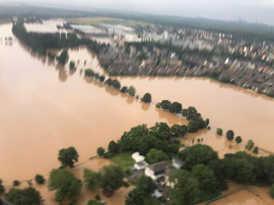 In Erftstadt wurde mit Hubschraubern ein vom Hochwasser eingeschlossenes Krankenhaus evakuiert. Dabei wurden auch rund 40 Betroffene von den Luftrettern der Rotkreuz-Bergwacht mit der Winsch zum Hubschrauber gezogen und in Sicherheit gebracht.