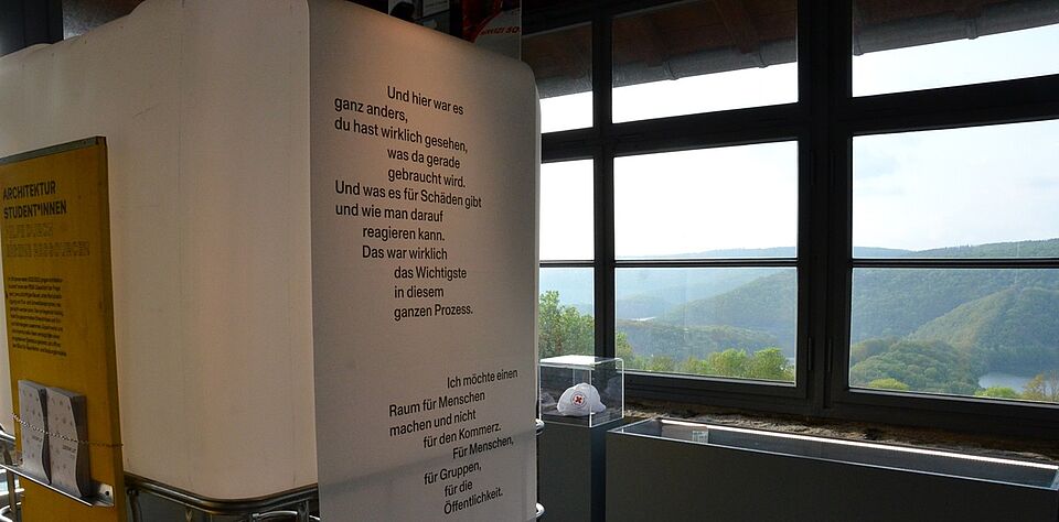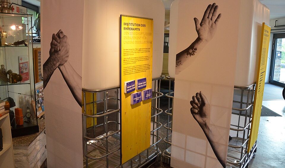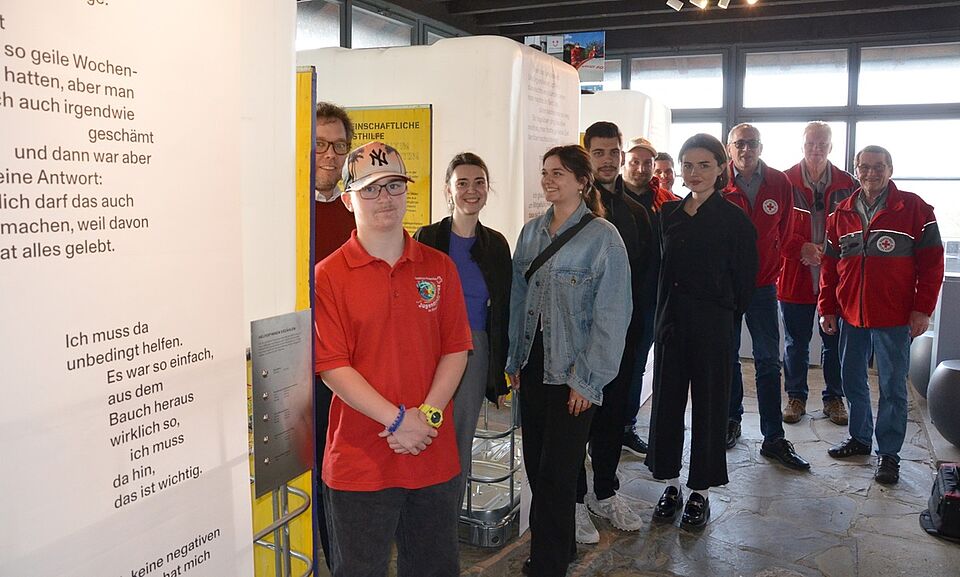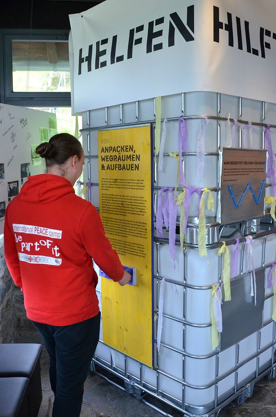 „Heute wollen wir feiern was war und was kommt“, freute sich Simon Jägersküpper, Geschäftsführer des „Rotkreuz-Museum vogelsang ip e.V“ vor versammelter Mannschaft aus Rotkreuzlern und Studenten der Hochschule Düsseldorf. Letztere, Theresa, Natascha, Alina und Tristan, hatten in ihrem Master-Studiengang „Exhibition Design“, also dem Design von Ausstellungen, Kunstwerke aus Wassertanks rund um das gegenseitige Helfen in ganz Deutschland entwickelt. Exemplarisch hatten sie dazu die Flutkatastrophe im Jahr 2021 in den Fokus genommen - und waren dazu mehrfach ins stark betroffene Ahrtal gereist.