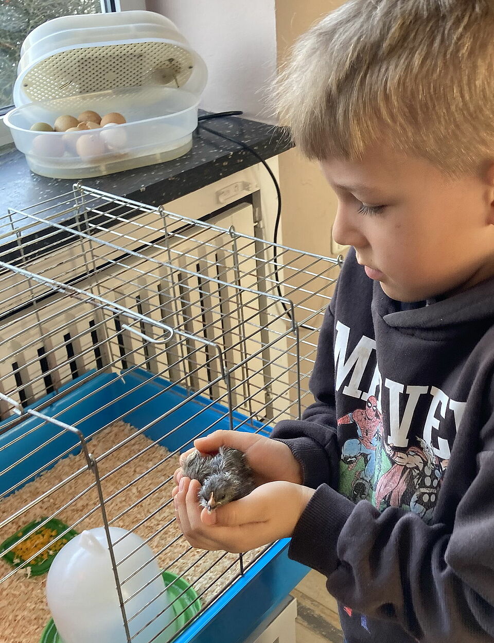 Wissbegierig wurden die Eier mit der Taschenlampe untersucht und dann dem Brutkasten überantwortet. Nach 21 Tagen spannenden Wartens begann dann das erste Küken, seine Eierschale zu durchbrechen, und die Kinder konnten dabei zusehen.