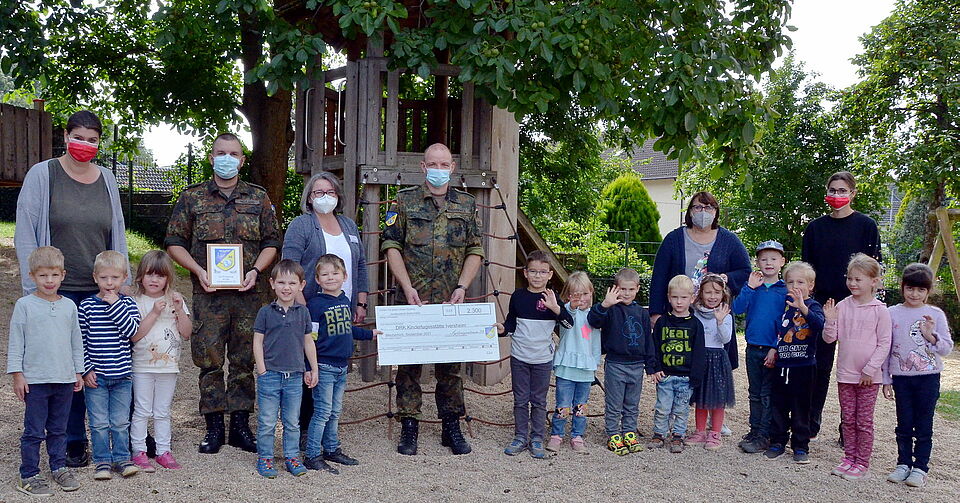 Iversheim – „Wir selber als Einrichtung waren glücklicherweise nicht betroffen. Trotzdem wurden die Kinder hier mit den schrecklichen Eindrücken konfrontiert, unter ihnen gab es große Unterschiede. Manche waren auch zuhause oder im persönlichen Umfeld sehr stark betroffen. Das zieht nicht spurlos vorbei und wir hoffen, ihnen mit dem Geld wieder etwas Spaß, gute Zeiten und Freude schenken zu können!“ Diese Worte stammen von Anja Scheffler, Leiterin der Rot-Kreuz-Kita, welche eine Spende der Bundeswehr am Dienstag, 21. September, dankend entgegennahm.
