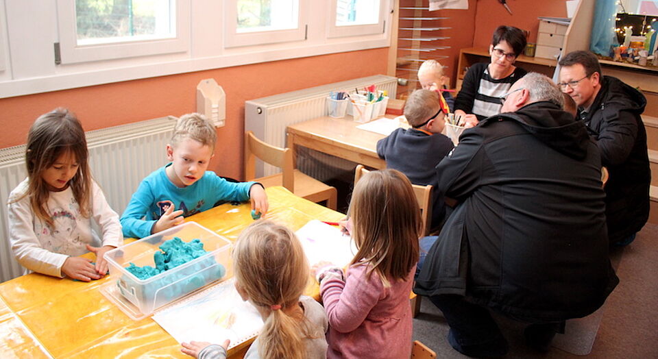 Im Innern des alten Pfarrhauses ist nun alles modern und kindgerecht eingestellt. Niedrige Tische und Stühle, natürlich passend für die Kinder – aber auch passend zu den teils niedrigen Türrahmen. „Ein bisschen sieht es aus wie in einem lebendigen Puppenhaus“, sagte einer der offiziellen Besucher. Jeder Winkel wurde genutzt, selbst eine Nische unter der Treppe, in die sich die Kinder zurückziehen und entspannen können. Auch eine Küche gibt es, denn zu Mittag essen die Kinder auch in der Gruppe. Erst nach 14 Uhr geht es rüber ins „Haupthaus“ des Familienzentrums.