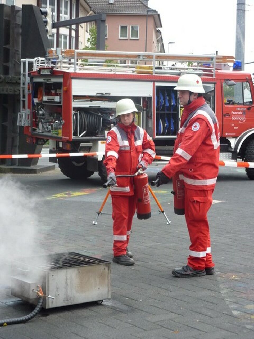 Bild DRK PJ | Solingen - Beim Landeswettbewerb der Bereitschaften gelang den Rotkreuzlern aus dem Kreis Euskirchen ein dritter Platz. An verschiedenen Stationen mussten sie ihr Können und Wissen beweisen und einsetzen, wie hier bei der Station Technik und Sicherheit beim Löschen eines Feuers.