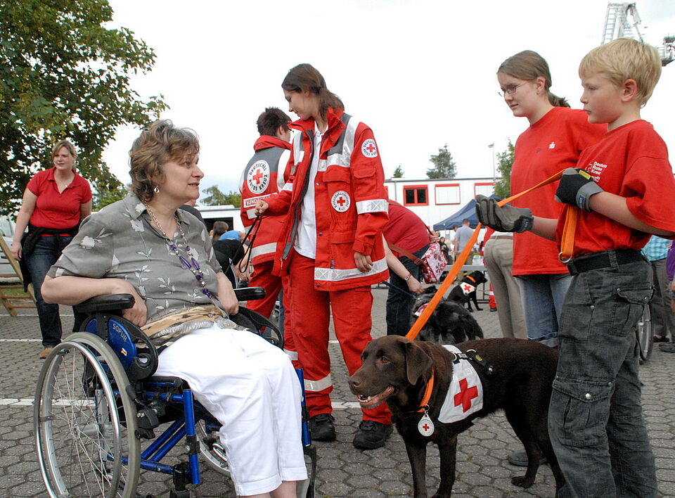Bild DRK HR | Außerdem trat die Rettungshundestaffel auf. Auch ihre Darbietung wurde mit viel Interesse gewürdigt. Nachher standen die Hundeführer noch für Gespräche, die Hunde selber für Streicheleinheiten zur Verfügung.