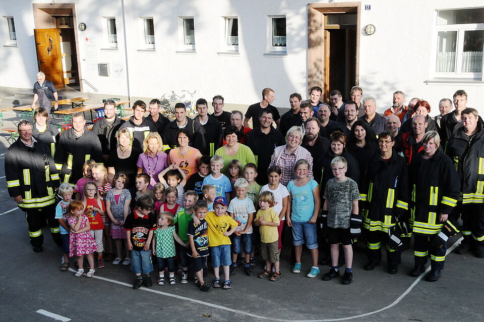 DRK SJ | Ripsdorf - Im Rotkreuz-Kindergarten "Kastanienlaube" übte die Feuerwehr gemeinsam mit den Kindern und Betreuerinnen einen Brand. Das Erinnerungsfoto zeigt, dass alles gut gegangen ist. Trotzdem werden zurzeit zusätzliche Notausgänge gebaut.