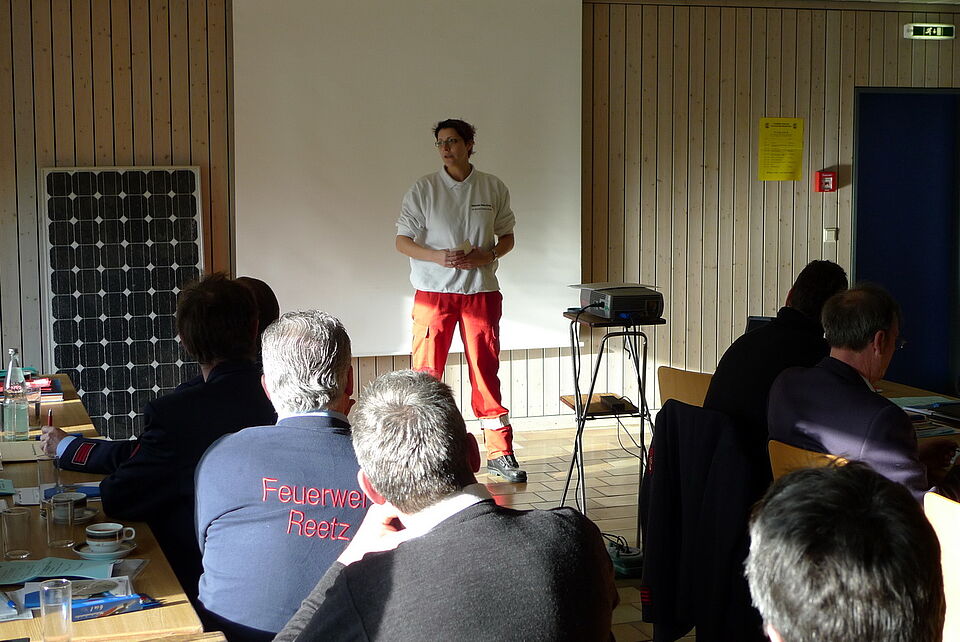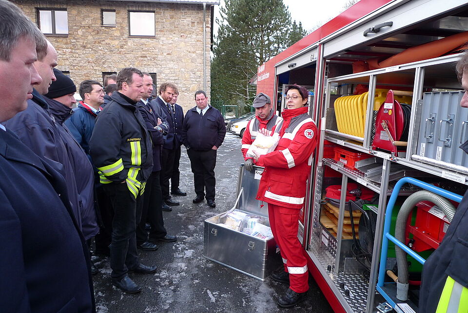 Bei einer Tagung der Führungskräfte der Blankenheimer Feuerwehr stellten Simone Pesch und Heinrich Weinand vom Roten Kreuz den Abrollcontainer für den Massenanfall von Verletzten vor. Bei größeren Unfällen oder anderen Schadensereignissen mit vielen Verletzten kommt dieser Container zum Einsatz.