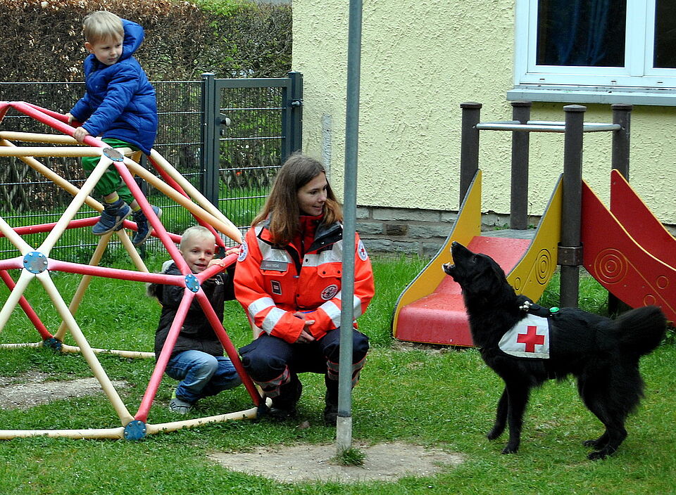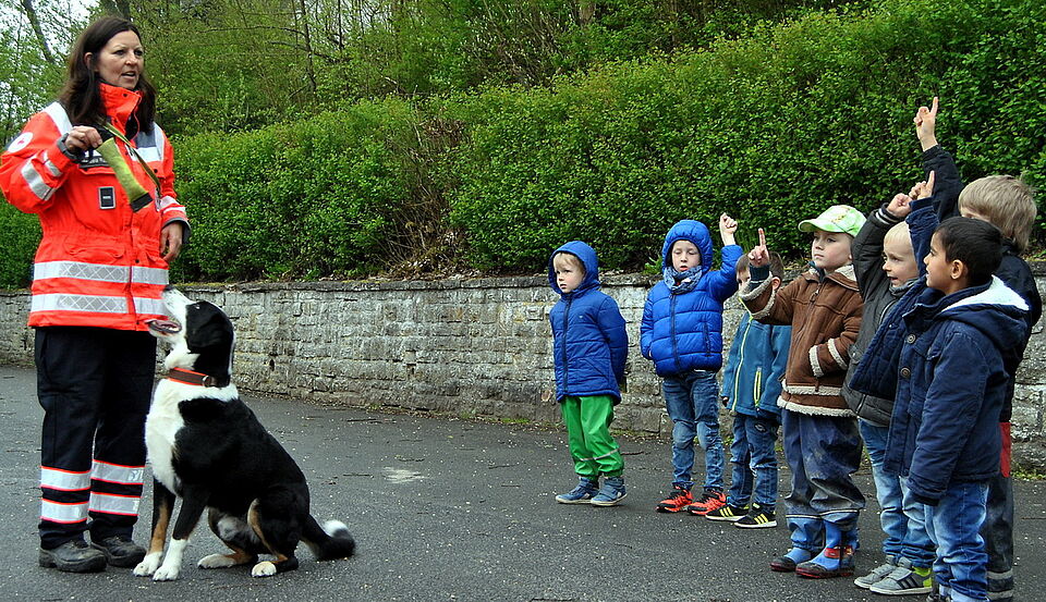 „Faszination Rettungshund“ heißt das speziell für Kindergärten entwickelte Angebot. „Dabei lernen die Kinder die Arbeit mit den Rettungshunden und eine der vielen Aufgaben des DRK kennen. Gleichzeitig ermöglicht es vor allem den Kindern, die keinen Bezug oder gar Angst haben, den Zugang zum Lebewesen Hund“, erklärte Franz Küpper. Das zeigte sich auch beim Besuch seiner Truppe im Blankenheimer Rotkreuzhaus. Denn da ging das Team besonders einfühlsam auf die Kinder ein, denen die Vierbeiner nicht ganz geheuer waren. Mit Erfolg: Anschließend trauten sie sich sogar, den Hunden zur Belohnung das Spielzeug zu werfen oder sich auf dem Außengelände der Kindertagesstätte suchen zu lassen.