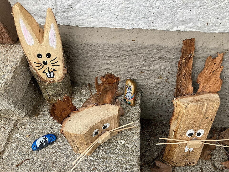 Rita Schmitz: „Bereits mehrere Familien haben einen Spaziergang zu unserem Waldwichtel unternommen. Wie wir auf Fotos sehen, ist er dort nicht mehr alleine! Es haben sich andere Wichtel sowie bunt bemalte Eifelsteine und inzwischen auch Hasen dazugesellt. Aber nicht nur im Wald, auch auf dem Außengelände der Kita sind Eifelsteine, Waldwichtel und Hasen zu finden!“