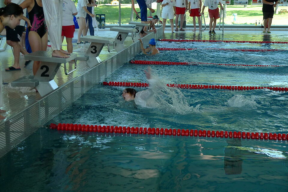 Im Schwimmbad trat man morgens gegen die Vertreter von Brandenburg, Rheinland-Pfalz, Sachsen, Thüringen an. Die packenden Staffelläufe wurden unter anderem von den Zuschauern Annemie und Karl-Heinz Schlewitz verfolgt, die in diesem Jahr seit mittlerweile 30 Jahren (!) als Schlachtenbummler die Mannschaften bei Rettungsschwimmwettbewerben begleiten. Ein Glück, denn Frau Schlewitz musste kurz vor Beginn der Kleiderstaffel noch einen Knopf an seine Hose nähen.