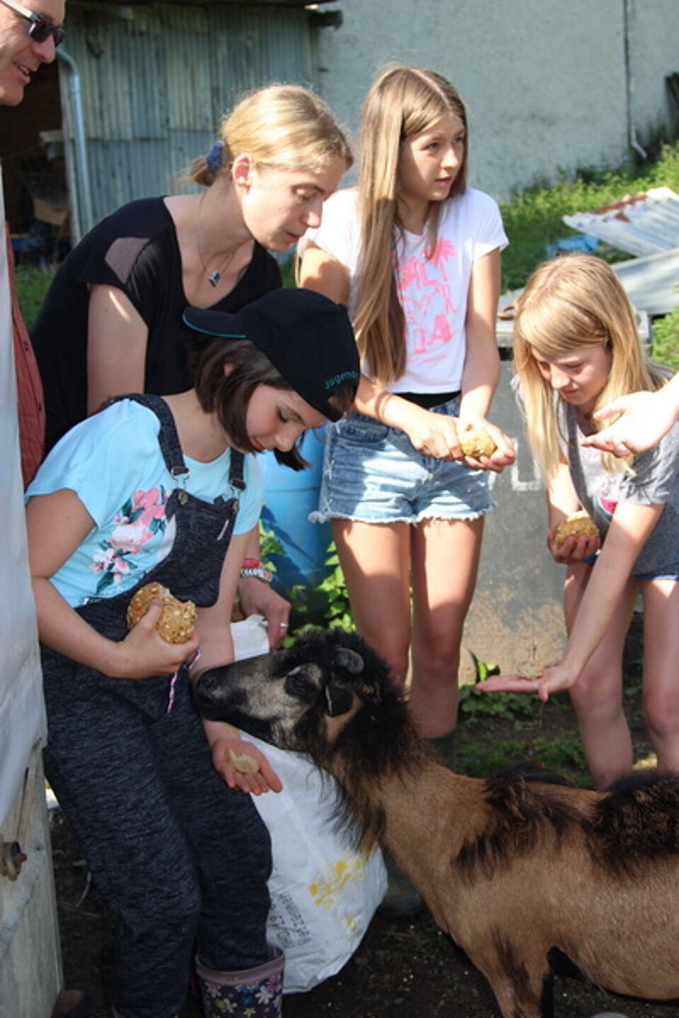 Die Anreise war recht kurzweilig, da die Kinder und Jugendlichen ein Lied selber komponierten. Am Zielort angekommen wurden zuerst die Jungtiere von Schafen und Schweinen mit den übrigen Tieren gefüttert. Hiernach ging es dann zum Aufschlagen des Lagers um ein zweites Frühstück zu essen.