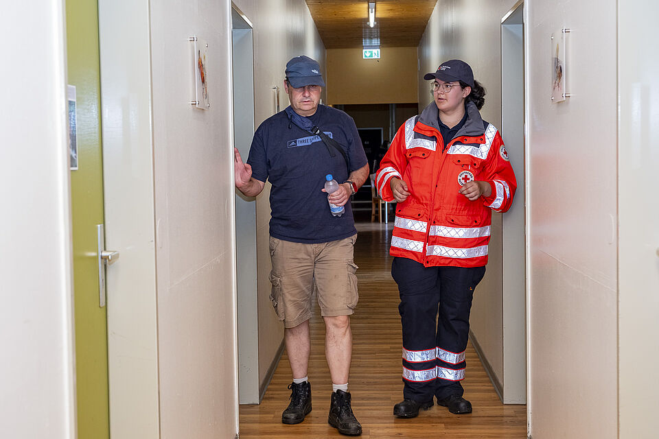 Dass eine solche Zusammenarbeit extrem wichtig ist, hat die Flut 2021 gezeigt. „Damals hatte das noch niemand auf dem Schirm“, erläutert Rolf Zimmermann, der mit dem DRK-Team in Vogelsang sozusagen Gastgeber für die Übung ist. Keiner habe damals gewusst, wo sind überall Pflegeplätze, wo werden Menschen zuhause gepflegt und wo müssen pflegebedürftige Menschen, teils bettlägerig, evakuiert werden. „Das ist definitiv ein unterschätztes Szenario“, sagt Zimmermann. Eines, das mit einer immer älter werdenden Gesellschaft deutlich an Bedeutung gewinnen wird.