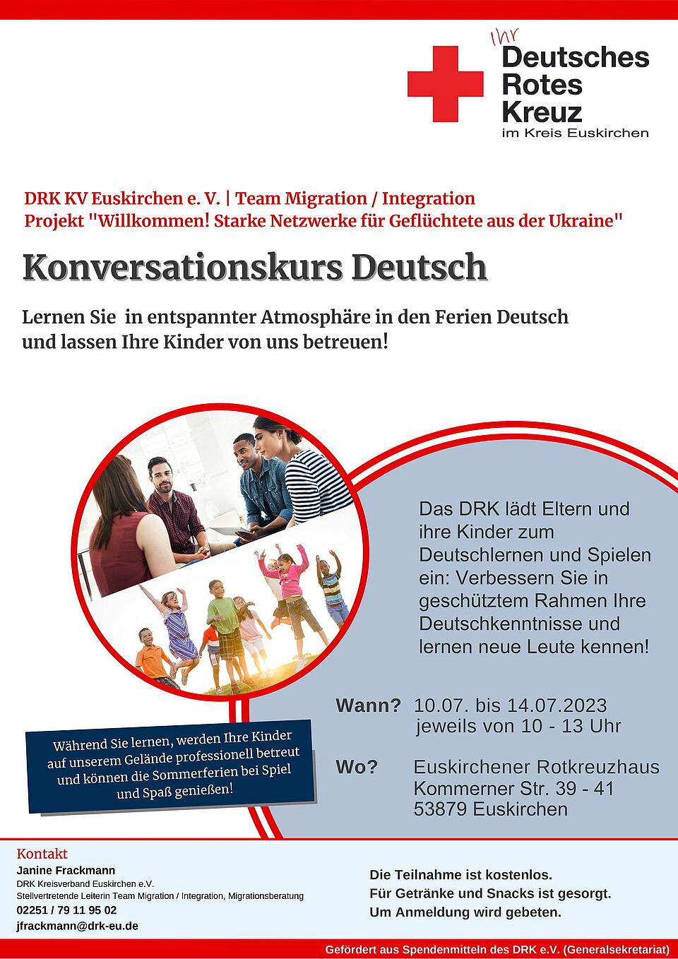 Euskirchen/Mechernich – „Deutsch für Eltern und Kinder“ lautet der Name eines „Konversationskurses“, den das Team Migration/Integration des DRK-Kreisverbandes Euskirchen von Montag, 10., bis Freitag, 14. Juli, bietet. Statt findet er jeweils von 10 bis 13 Uhr im Euskirchener Rotkreuzhaus in der Kommerner Straße 39 bis 41. Auch die Mechernicher Stadtverwaltung weist ihre Bürger hierauf hin.