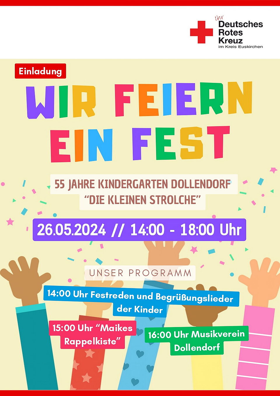 An diesem Tag sind von 14 bis 18 Uhr alle ehemaligen Kindergartenkinder, Kolleginnen, Nachbarn und Freunde des DRK-Kindergartens Dollendorf sowie die örtlichen Vereine herzlich eingeladen mitzufeiern (Antoniusstraße 1, 53945 Dollendorf). Geboten wird übrigens so Einiges: Los geht´s um 14 Uhr mit Festreden und Begrüßungsliedern der Kids. Um 15 Uhr tritt „Maikes Rappelkiste“ auf, bevor der „Musikverein Dollendorf“ ab 16 Uhr live aufspielt.