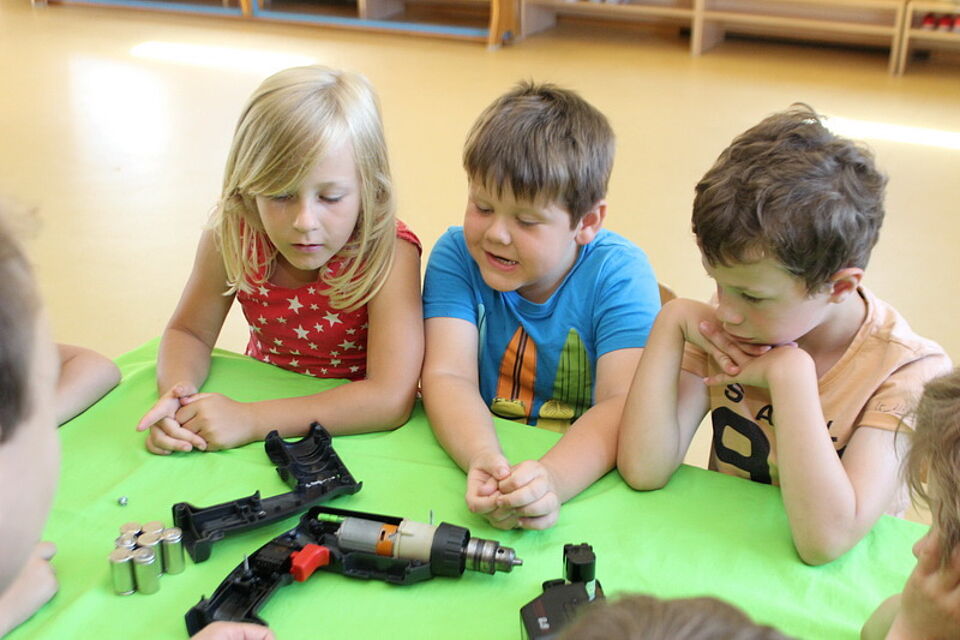 Dann dürfen die Kinder selbst loslegen. An Tischen bauen sie einen Akkuschrauber auseinander und experimentieren. Wie funktioniert so ein Gerät überhaupt? Wie kann man einen Akku mit Sonnen- oder Windenergie wieder aufladen? Und warum dürfen die alten und kaputten Geräte und Spielzeuge nicht einfach in die große graue Hausmülltonne. So erfahren die Kinder auch, wie wertvoll alte Elektronikgeräte sind. So wertvoll, dass man sie nicht einfach wegwirft, sondern sammelt und zurückbringt, damit aus „Alt“ „Neu“ gemacht werden kann.
