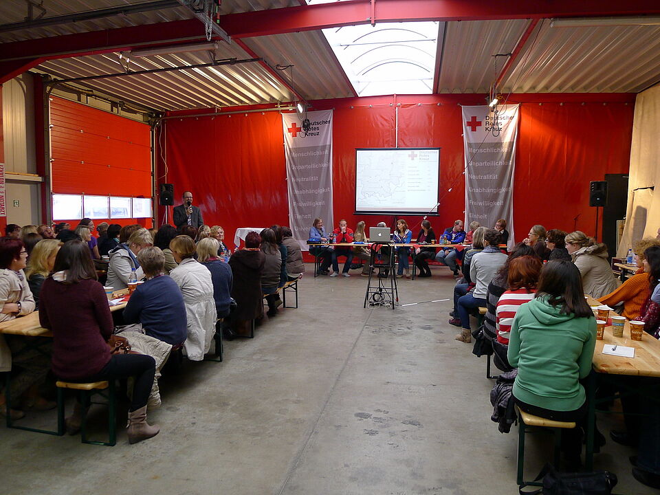 In der umfunktionierten Fahrzeughalle des Rotkreuz-Zentrums fanden sich heute zahlreiche Angestellte zur diesjährigen Betriebsversammlung ein. Beate Kruse, Vorsitzende des Betriebsrats, führte durch die Veranstaltung.