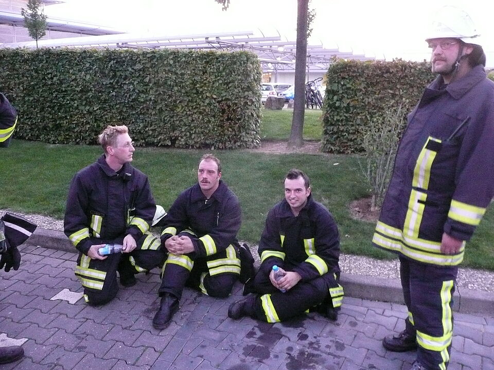 Bild DRK ZR | Erschöpft nach einem anstrengenden Einsatz, (vl) Jens Keute, Marc Vrolichs, Daniel Kurenbach und Markus Hunold.
