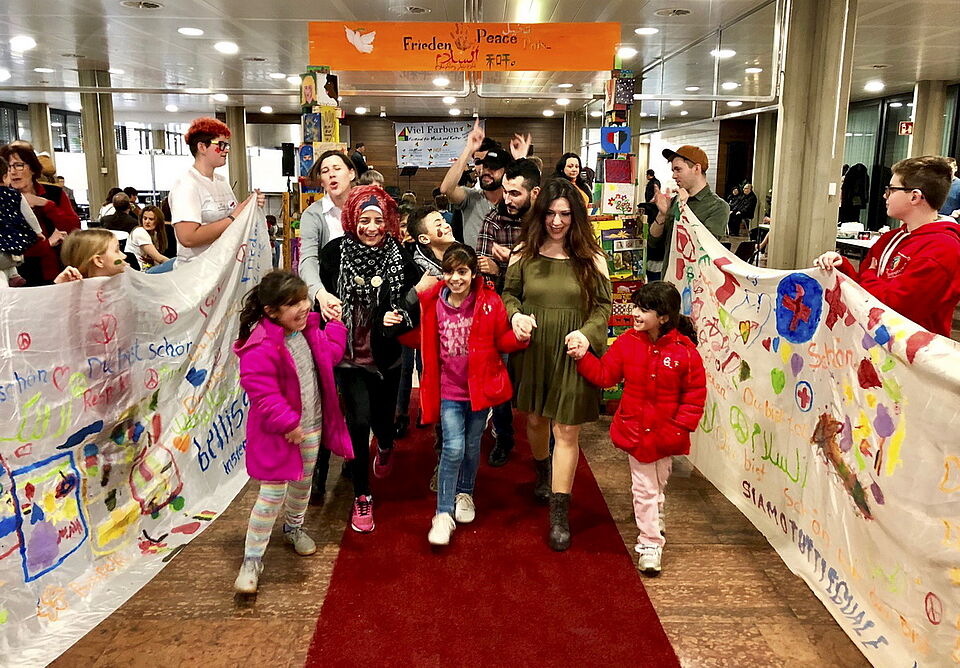 Am Nachmittag enthüllten die Projektmitarbeiter auch noch zwei Transparente und bildeten so einen Gang. Durch das Tor, über einen roten Teppich, konnten die Besucher des Friedenstages gehen, rechts und links, hinter den Transparenten, standen weitere Besucher Spalier und applaudierten.