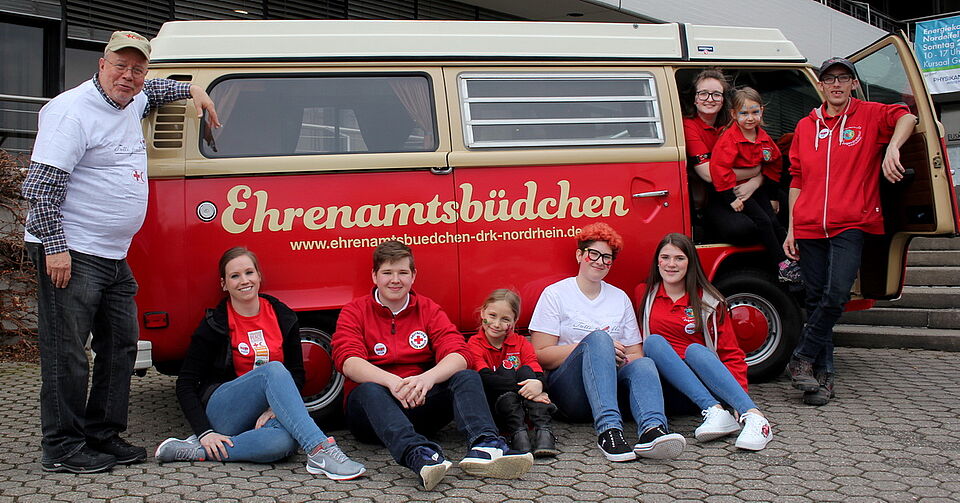 Natürlich wieder mit von der Partie war das Deutsche Rote Kreuz – und zwar in vielfacher Ausprägung. Die Hilfsorganisation lieferte schon vor dem Kreishaus den ersten Blickfang in doppelter Ausführung. Zwei VW-Bully-Oldtimer: einer aus dem Jahr 1974, der dem Euskirchener Kreisverband gehört, und dann ein knallroter mit der Aufschrift „Ehrenamtsbüdchen“ aus dem Jahr 1979. Letzterer gehört dem DRK-Landesverband und war zum allerersten Mal überhaupt im Einsatz.
