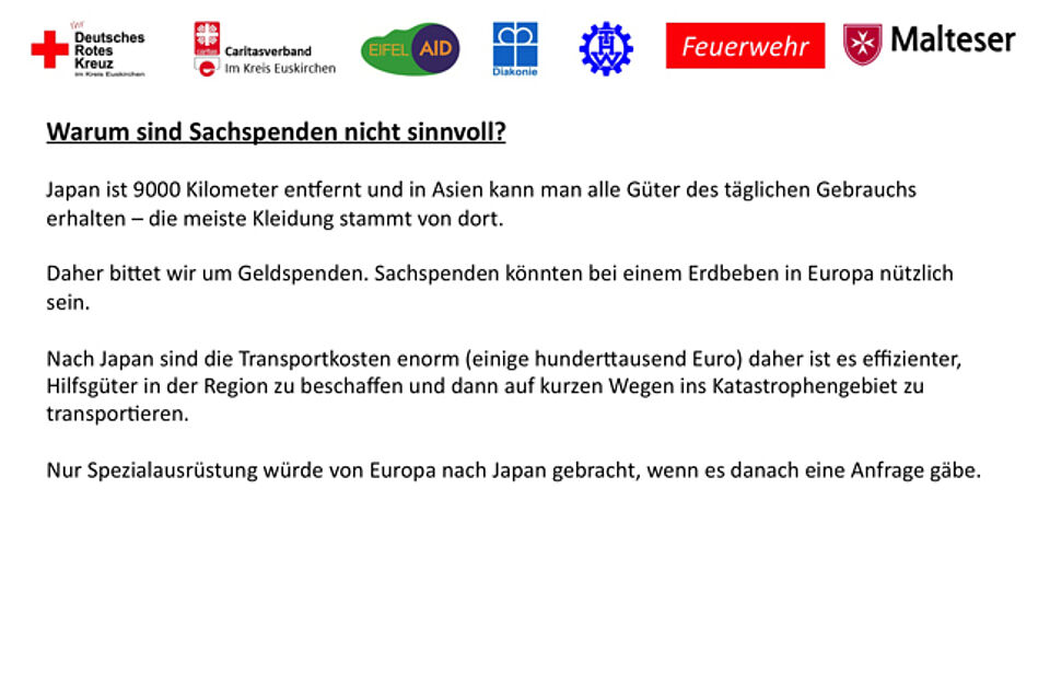 Erst eine Woche zuvor hatte das Rote Kreuz eine breit angelegte Spendenaktion ins Leben gerufen, an der sich die im Kreis Euskirchen vertretenen Hilfsorganisationen beteiligen. „Hier ist gegeben, dass das Geld auch da ankommt, wo es gebraucht wird“, betonte Erwin Doppelfeld die Effizienz des gemeinschaftlichen Engagements.