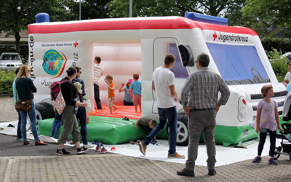 Natürlich beteiligte sich auch einer der beiden Hausherren des Geländes ausgiebig am Programm. Das Deutsche Rote Kreuz stellte nicht nur seine Fahrzeughalle zur Verfügung, in der die Besucher sich laben konnten. Das Jugendrotkreuz hatte wieder seine Hüpfburg in Form eines Rettungswagens aufgebaut, die sich großer Beliebtheit bei den kleinsten Besuchern erfreute. Die Eltern konnten sich derweil im Pavillon der Familienbildung über deren Jahresprogramm erfreuen. DRK-Kitas hatten Spiele für Kinder im Angebot. Am Nachmittag zeigte die Rettungshundestaffel, was sie kann. DRK-Geschäftsführer Rolf Klöcker zeigte sich dann auch schon mittags begeistert vom Andrang, der herrschte.