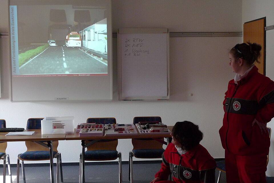 Bild DRK ZR | In einem Seminarraum des Rotkreuz - Zentrums Euskirchen / Eifel werden diese Übungen durchgeführt. Auf der Leinwand sehen die Rettungsdienstler die Unfallsituation bei der Ankunft am Unfallort.