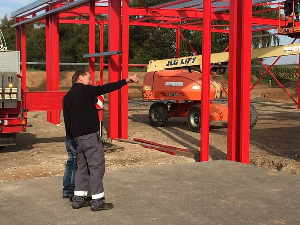 Weiter geht´s mit der Erweiterung der Fahrzeughalle am Rotkreuz Zentrum Euskirchen / Eifel. In dieser Woche wurde bei bestem Wetter das Grundgerüst der Fahrzeughalle montiert. Klasse Arbeit bisher! Wir sind gespannt wie es nächste Woche weitergeht.