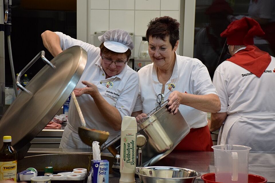 Nicht nur die Ärzte an den Liegen haben mächtig viel zu tun, auch die Helfer in der Küche wirbeln kräftig. Immer weiter sorgen letztere für Nachschub am Büffet, an dem sich die Blutspender nach dem Aderlass stärken können. Schon seit dem Morgen waren die Küchenhelfer aktiv. „Wir machen das ja immer alles frisch“, betont Engelen.