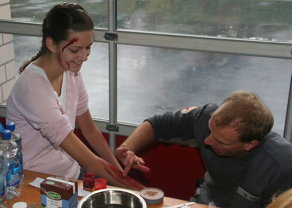 Nach einer fast dreistündigen Arbeit der RUD-Gruppe waren die Darsteller für die Übung vorbereitet. Sie wurden in den Hintergrund der Übung "eingeweiht" und auf ihre Rolle als Verletztendarsteller vorbereitet.