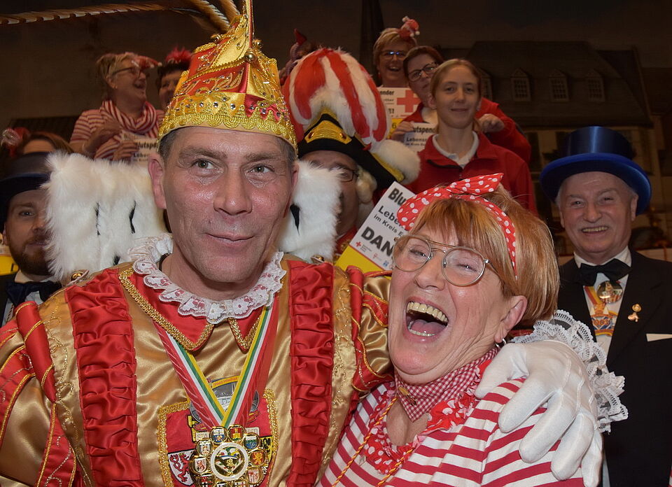 Für Tollitäten und kostümierten Anhang werde ein eigener Raum reserviert, so die Blutspende-Beauftragte: „Um die anderen Spender nicht zu stören.“ Lecker zu essen und zu trinken gebe es hingegen für alle. Das gelte im Übrigen für alle Rotkreuz-Blutspende-Termine im Kreis: „Die Bewirtung durch spezielle Rotkreuzteams ist immer und überall vorzüglich!“