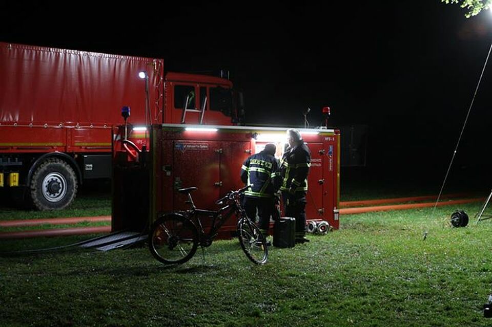 Die gesamte Nacht über wurde die Wasserförderstrecke in Betriebe gehalten und im Schichtsystem von den Helfern betreut. Auch die Beleuchtung der gesamten Wegstrecke wurde aufrechterhalten, um die Sicherheit der Einsatzkräfte zu gewährleisten.
