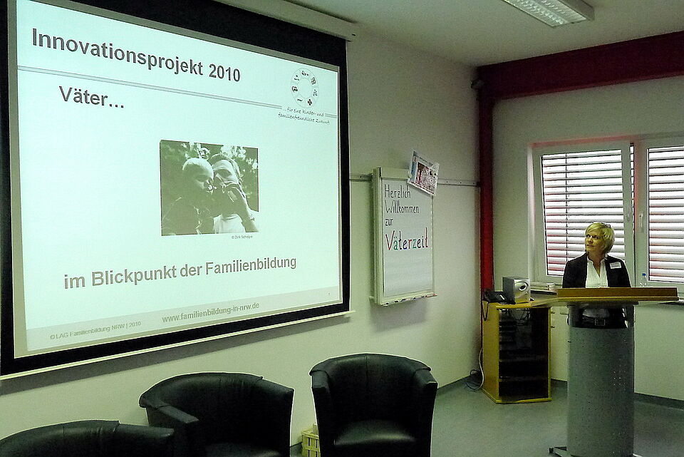 Beim Euskirchener Praxistag wurden nicht nur Referate gehalten. Heike Trottenberg von der Steuerungsgruppe der Landesarbeitsgemeinschaften der Familienbildung in NRW, selbst „Frontfrau“ in Sachen Väterarbeit und Leiterin der Familienbildung des Roten Kreuzes in Hilden, gab eine Einführung ins Projektkonzept „Väter 2010“.