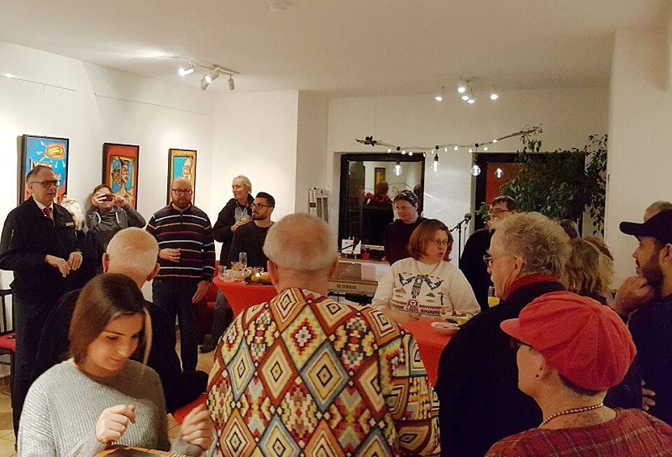 Die international ausgewiesene Künstlerin Maf Räderscheidt würdigte im Anschluss Ismail Laghbabas künstlerisches Werk. Laghbabas Weg als Künstler verfolge sie seit 2016. In dieser Zeit habe er sich beeindruckend entwickelt. In den im Café Henry ausgestellten Bildern habe er, ausgehend vom Surrealismus eines Francis Bacons und eines Egon Schieles, eine ganz eigene Bildsprache gefunden und interkulturelle Weltkunst geschaffen.
