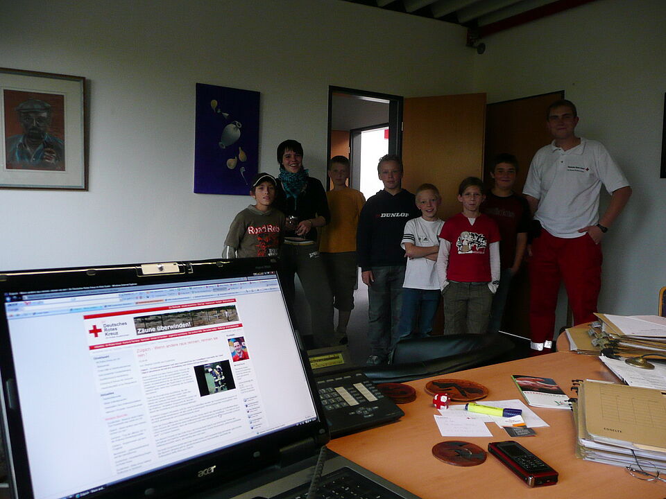 Bild JRK EU | Beim Chef im Büro schauen sich die jugendrotkreuzler an, wie die Rotkreuz-Homepage bearbeitet wird.