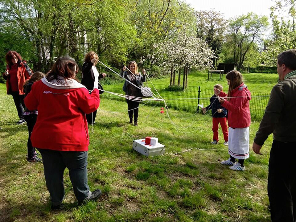 Bild DRK JS | Hier gilt es im Team aus 9 Holzsteinen ein Rotes Kreuz zu bauen.