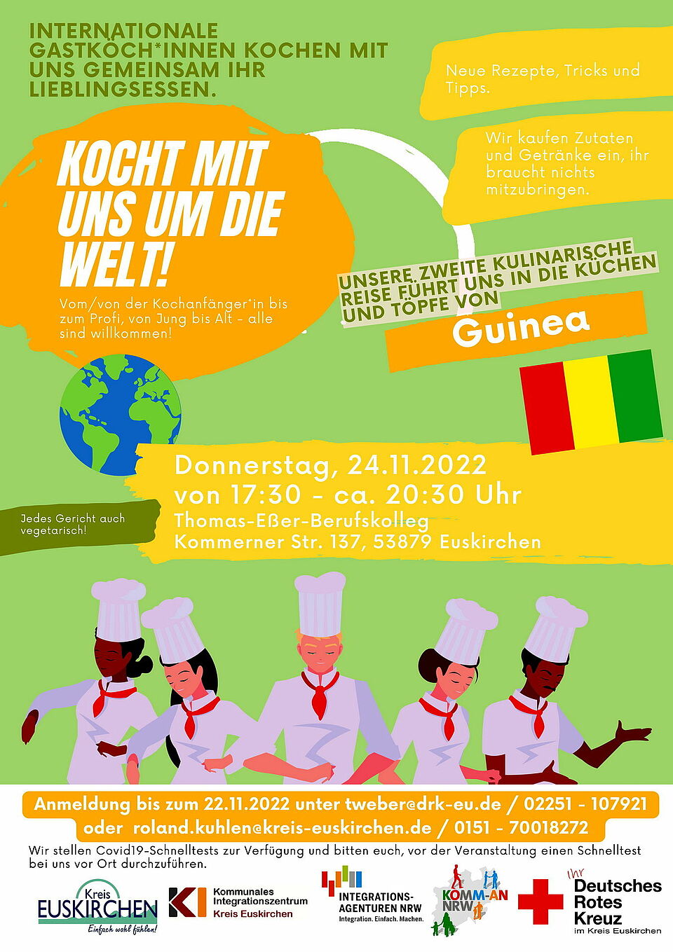 „Dieses Mal führt uns die kulinarische Reise in die Küchen und Töpfe von Guinea/Westafrika“, so die Veranstalter: „Wir kaufen die Zutaten und Getränke ein, ihr braucht nichts mitzubringen. Jedes Gericht gibt es auch vegetarisch.“