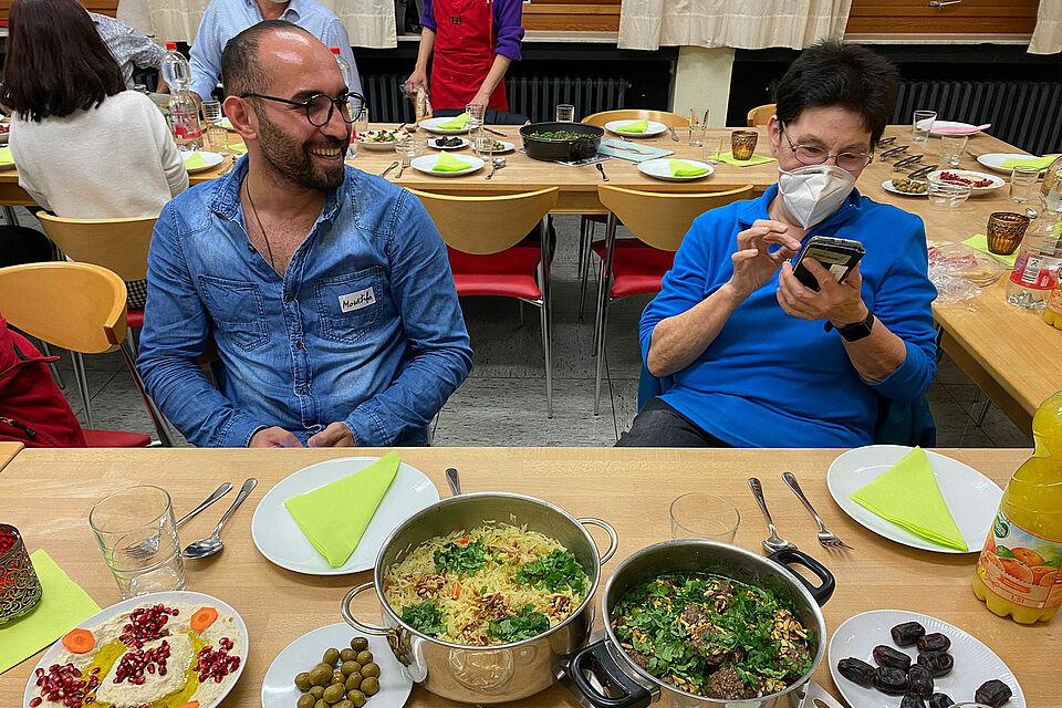 So geht die bunte Mischung an Nationen und unterschiedlichen Biografien an den Kochinseln weiter. „An dem Abend sind neue Kontakte und interkultureller Austausch entstanden. Damit haben wir unser Ziel erreicht“, sagt Thomas Weber vom DRK, der im Rahmen des Projekts „Mensch, Respekt! Für Fairness und Menschlichkeit im Kreis Euskirchen“ unter anderem solche Begegnungsangebote organisiert. Zusammen mit Joumana El-Khodr hatte er die Zutaten besorgt, damit neben dem leckeren Nachtisch auch die beiden anderen Gänge gekocht werden konnten.